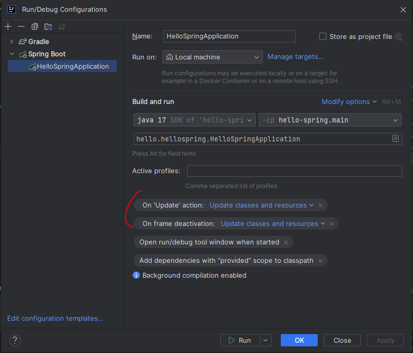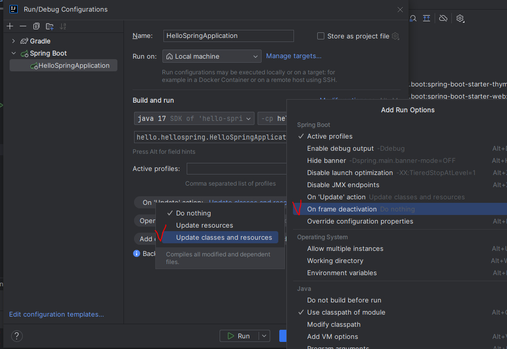 Edit Configurations... > Modify oprions > On frame deactivation > Update classes and resources 선택