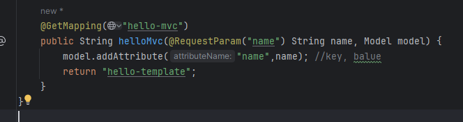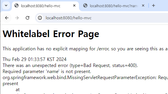 http://localhost:8080/hello-mvc 접근시 에러 > 컨트롤러에 정의한 name 파라미터가 필요하기 때문