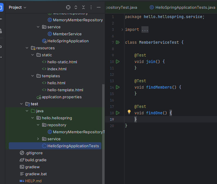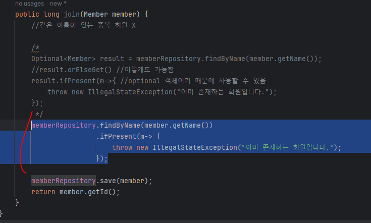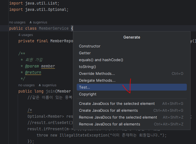 기존 소스에서 MemberService 에서 @Service 와 @Autowired 를 제거하고