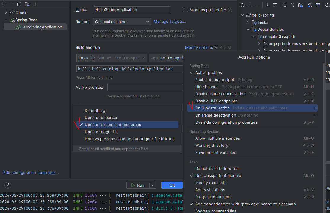 Edit Configurations... > Modify oprions > On frame deactivation > Update classes and resources 선택